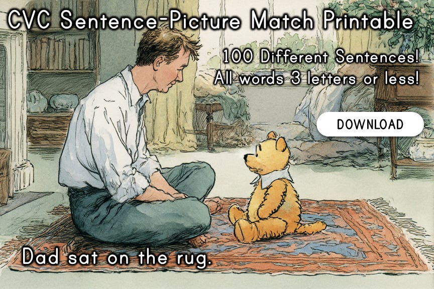 So, I’ve created 100 different simple CVC sentences with matching pictures, BUT each page has 4 different sentences to match to pictures. It’s free for a limited time!