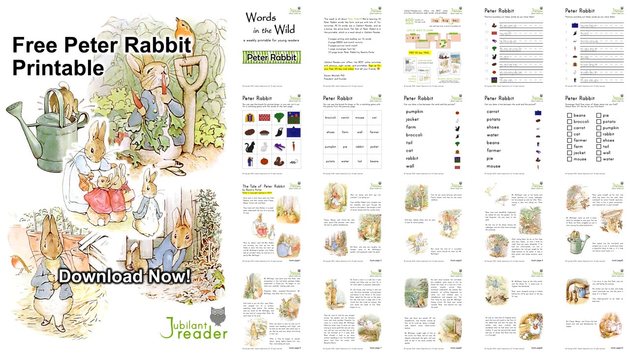 Here’s a FREE printable for Peter Rabbit, from our Teachers Pay Teachers. The printable includes the complete book by Beatrix Potter, along with tons of fun activities! Jubilant Reader features read alouds from many classics such as these.